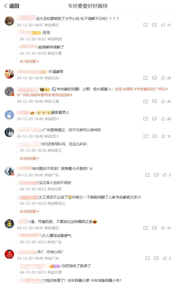 在韋世豪的微博評論區(qū)下充斥著兩種聲音,一種認為韋世豪當初也是廣州隊隊長,有什么事可以商量,另一種則認為俱樂部欠債還錢天經(jīng)地義。你怎么看?